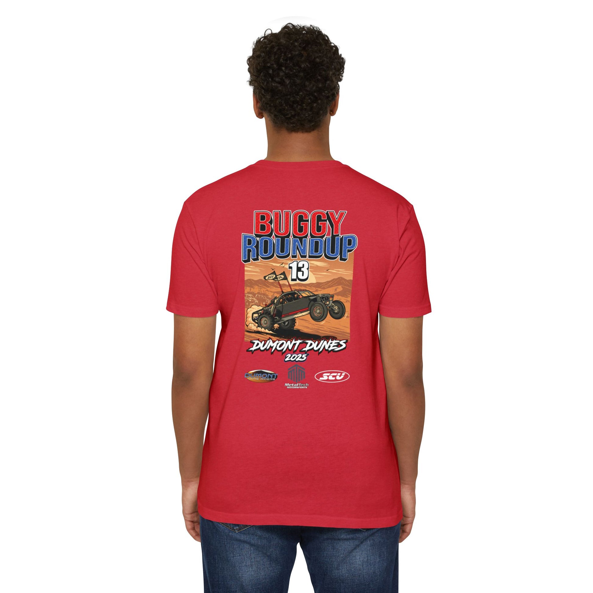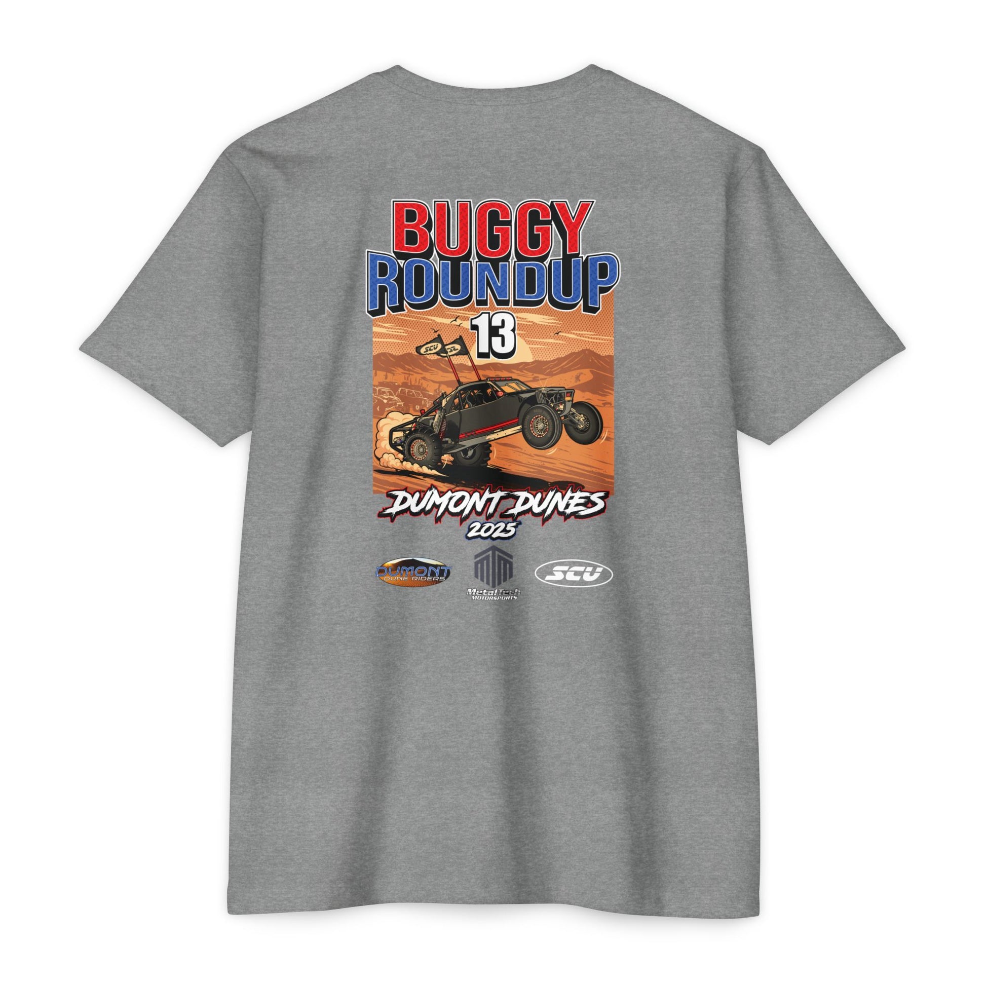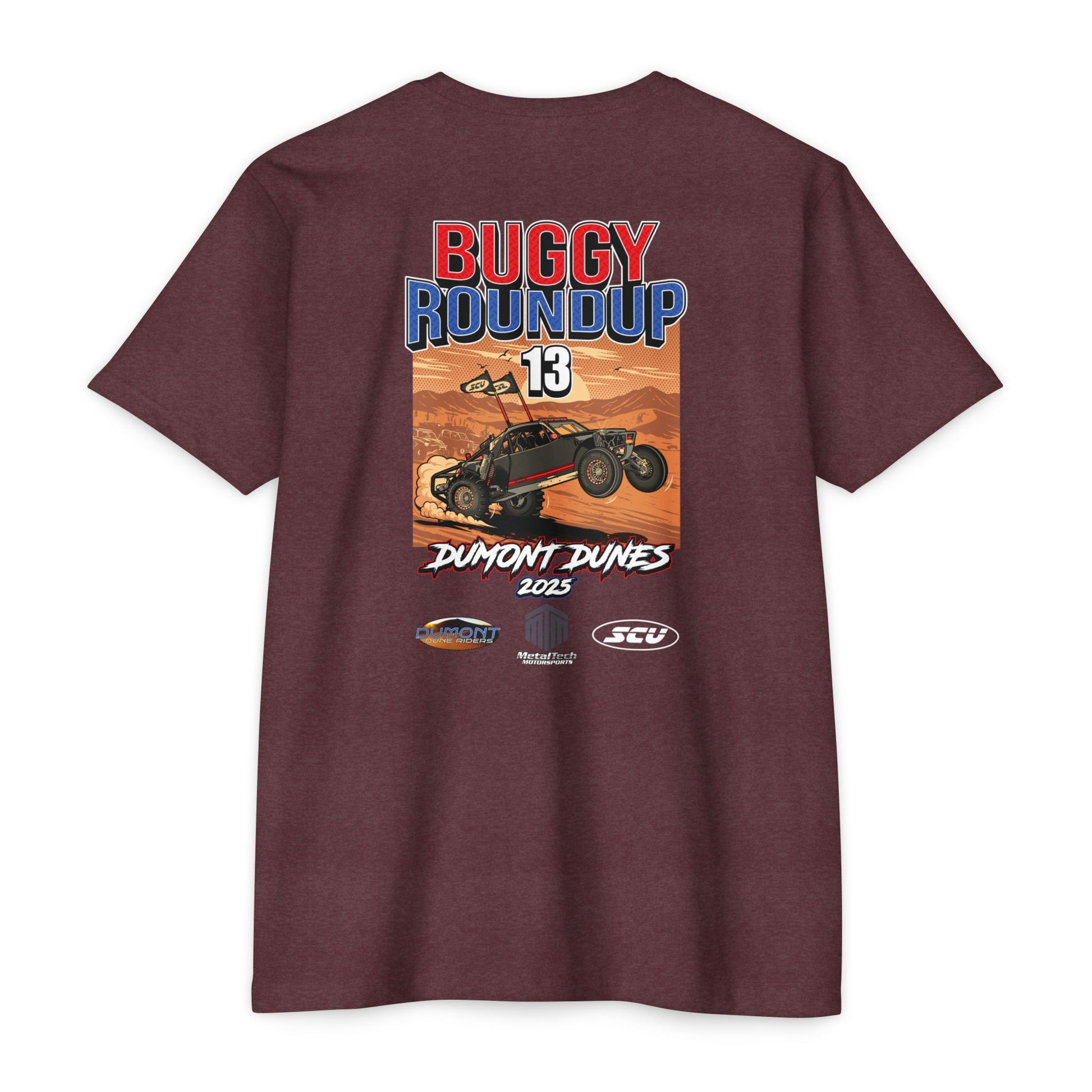 We went with a bold desert scene, an SCU sandcar throwing roost, and clean Buggy Roundup branding. Back print is full-size, front has a small logo. Printed on many different color tees that are soft, durable, and perfect for wearing all season long.